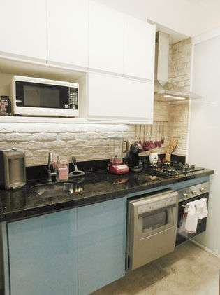 De um lado ficou uma longa bancada com cozinha, área de serviço e churrasqueira e do outro lado sala de estar, sala de jantar e espaço gourmet.