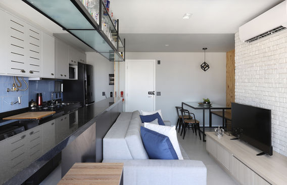 Projeto de apartamento compacto para um casal jovem, com 60m² toda a parte social foi integrada unindo sala, cozinha, área de serviço e terraço.